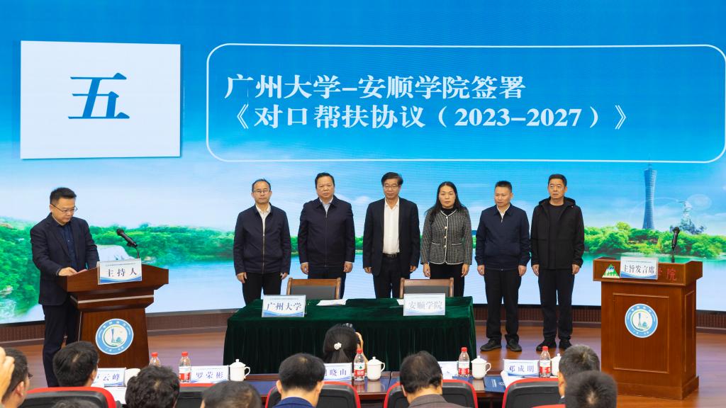 广州大学副校级领导邓成明和安顺学院党委委员、副校长代表殷红敏共同签署了两校《对口帮扶协议(2023-2027)》。国家乡村振兴局开发指导司原副司长、二级巡视员刘晓山,贵州省政府副秘书长、粤黔协作工作队领队胡爱斌,安顺学院党委书记罗荣彬,广州市协作办区域合作处处长、一级调研员陈俊容,上台见证了签约仪式。