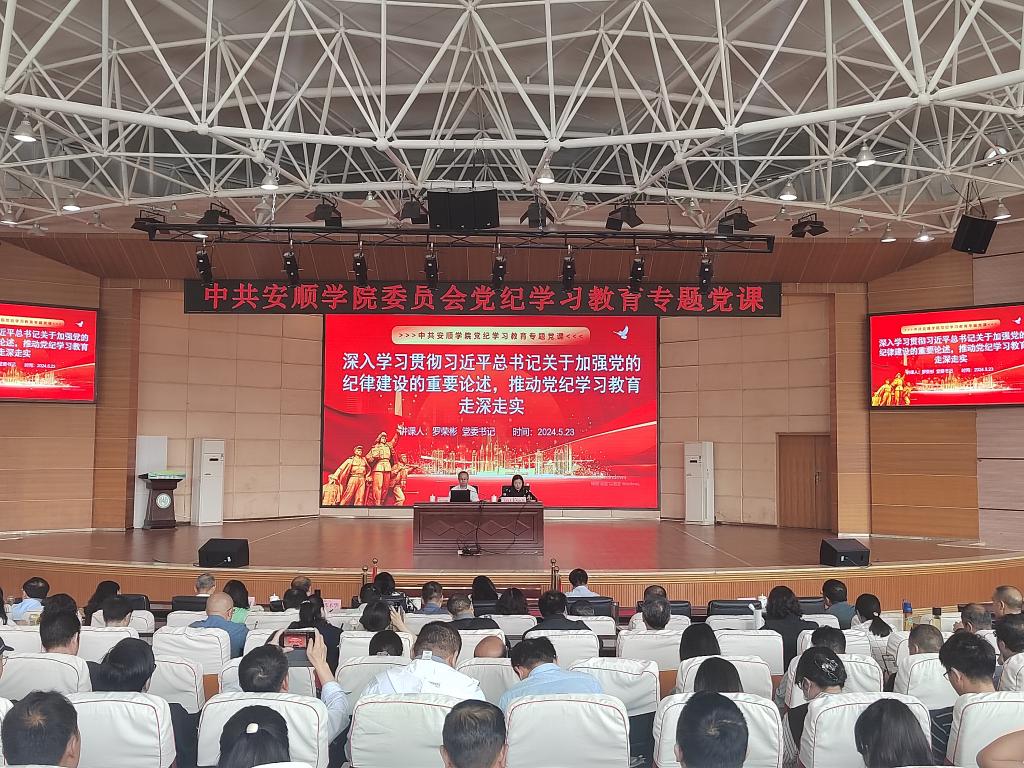 5月23日上午,安顺学院党委书记罗荣彬以“深入学习贯彻习近平总书记关于加强党的纪律建设的重要论述,推动党纪学习教育走深走实”为题讲党纪学习教育纪律党课。安顺学院校长曾丽及全体在家校领导出席党课,全校科级以上领导干部,纪委委员、纪检委员、纪检监察干部以及新提拔干部、年轻干部、关键岗位干部参加党课。安顺学院党委委员、纪委书记、监察专员蔡红英主持党课。