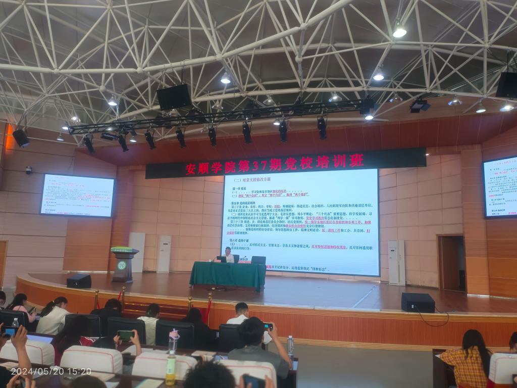 2024年5月20日,安顺学院第37期党校培训班在学术报告厅开班,安顺学院党委副书记陶文彩出席开班典礼并授课,559名入党积极分子和发展对象参训,学校党委委员、组织部部长何朝越主持开班典礼。