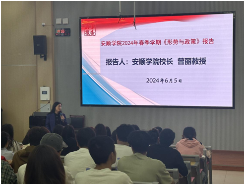 6月5日下午,安顺学院校长曾丽教授以“把握经济全球化大势扩大高水平对外开放”为题,在安顺学院顺理楼阶梯教室为政法学院、数理学院的青年大学生作2024年春季学期形势与政策报告。报告会由马克思主义学院院长黎进深主持。