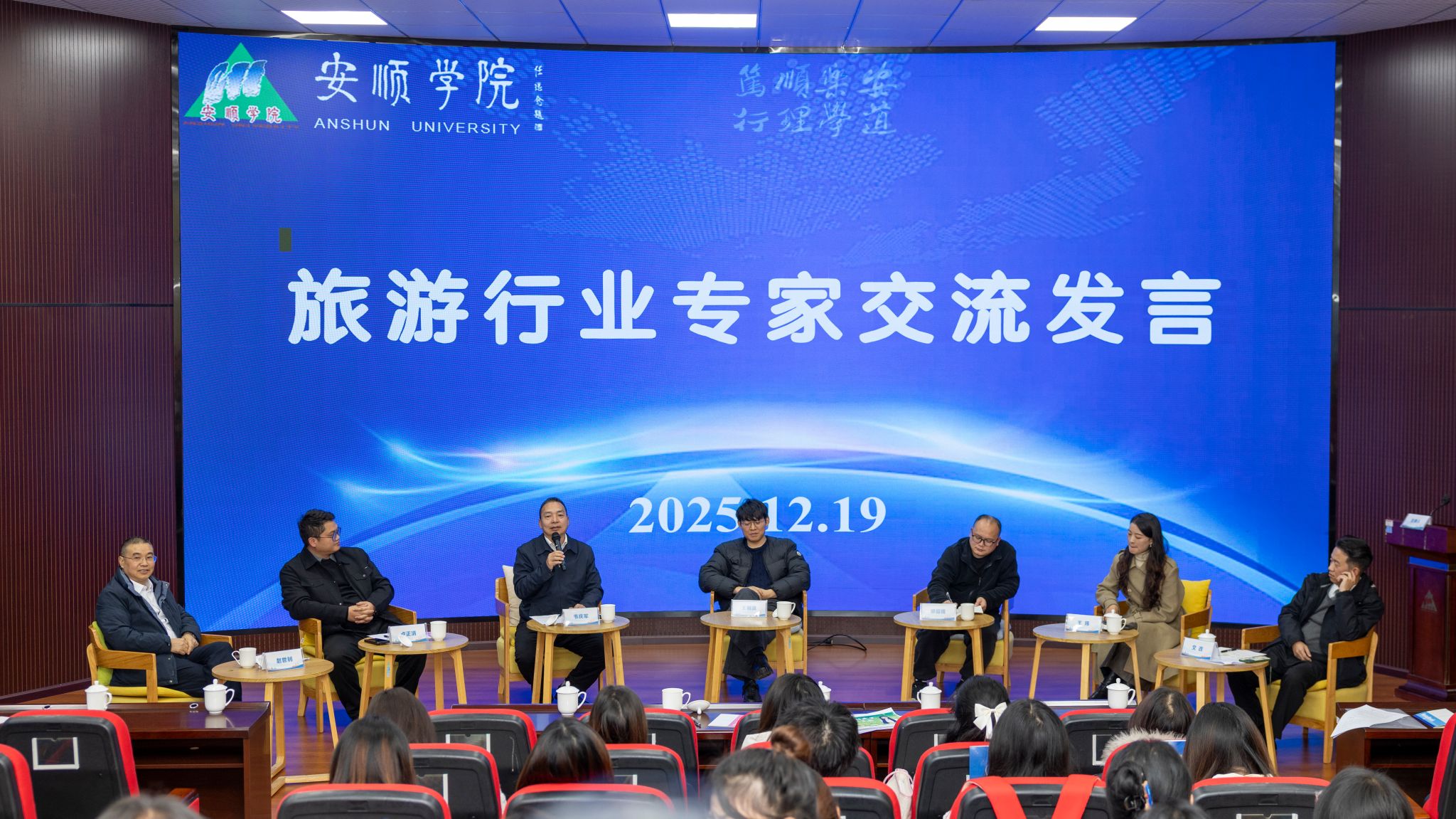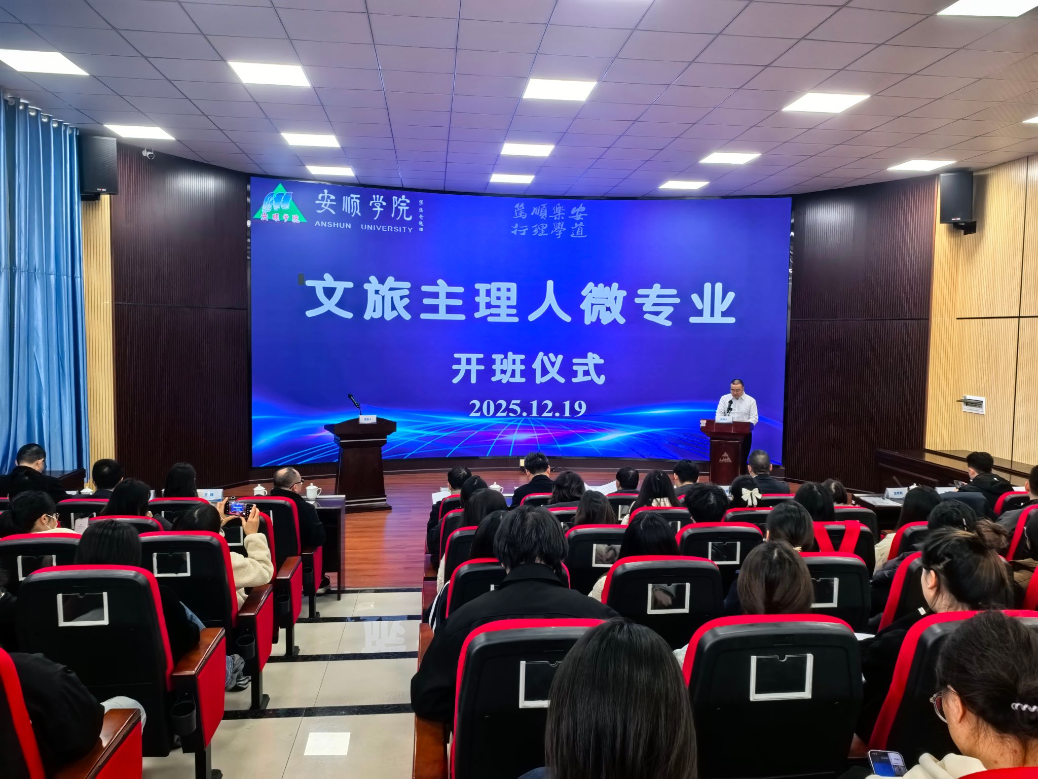 2025年12月19日下午,旅游管理学院在安道楼二楼会议室举行“文旅主理人”微专业开班仪式,标志着学校在文旅融合人才培养方面迈出实质性一步。安顺学院副校长张来、贵州旅游产业发展集团总法律顾问刘国凡出席并致辞。贵州哇噢旅游发展有限公司、贵州中壹贝山商贸有限公司、桂林三合一规划设计有限公司、贵州天悦旅游集团、贵州皓宇旅行社、安顺同袍旅游发展有限公司等企业负责人出席开班仪式,并与学院师生进行深入交流。仪式由安顺学院旅游管理学院院长赵世钊主持。
