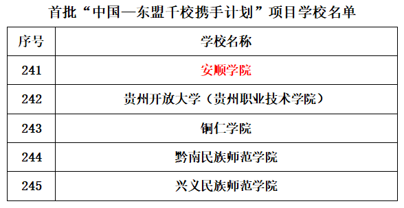 2024年9月8日,根据中国教育国际交流协会秘书处发布的《关于对首批“中国一东盟千校携手计划”项目学校名单进行公示的通知》文件,安顺学院荣获首批“中国—东盟千校携手计划”项目。