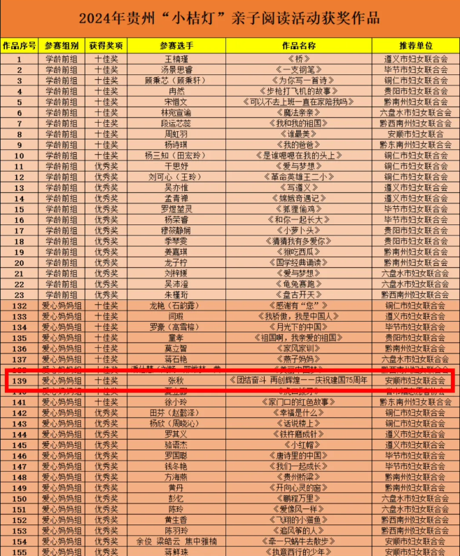 由安顺学院妇联推荐的“爱心妈妈”组阅读作品政法学院张秋老师的《团结奋斗 再创辉煌 ——庆祝建国75周年》获贵州省十佳奖、安顺市一等奖。(文/图:学生记者 吴梓均)