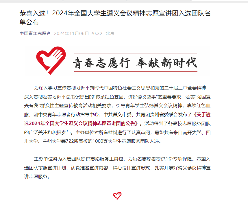 近日,由团中央青年志愿者行动指导中心、中共遵义市委、共青团贵州省委联合开展的2024年全国大学生遵义会议精神志愿宣讲团入选团队名单公布,共有来自全国722所高校的1000支大学生志愿服务团队入选。安顺学院“红色传承,遵梦前行”——遵义会议精神志愿宣讲团成功入选。