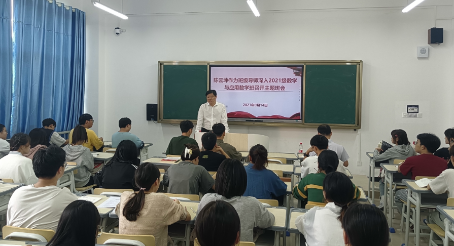 9月14日下午,安顺学院党委副书记、校长陈云坤作为班级导师召开2021级数学与应用数学班主题班会。本次班会以“学习贯彻习近平新时代中国特色社会主义思想主题教育”为主题,数计学院专职辅导员黄娜老师及2021级数学与应用数学班全体同学参加。班会由数计学院钱淑渠教授主持,