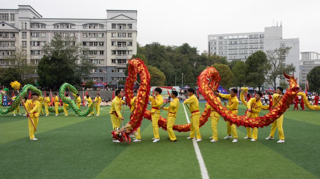 之后,广播体操队员们精神饱满,热情高涨,认真投入,用整齐划一的动作,端庄秀丽的姿态揭开精彩的文艺表演。在铿锵锣鼓声中,首蒙青巾,腰围战裙,戴脸子于额前,手执戈矛刀戟之属的展演者用急如瀑雨,畅若飞燕的身姿再现金戈铁马的征战故事,再现被誉为“中国戏剧活化石”的安顺地戏。充满活力的踏板操激情律动,健身气功《八段锦》集国术精华之集如锦缎般柔顺。舞龙表演《龙腾盛世》将文艺表演再次推向高潮。