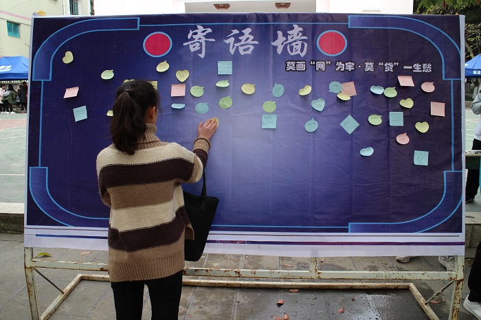同学们手写抵制不良网贷的寄语贴在寄语墙上