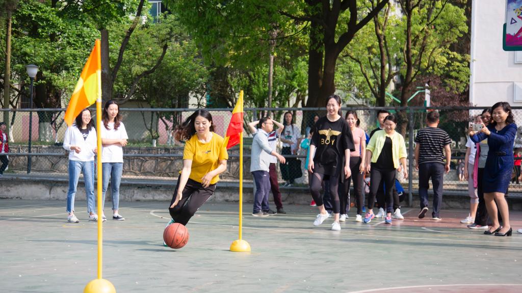 本次运动会设置了绕障碍物运球接力、呼啦圈竞走接力、赶“猪”跑接力、长绳“8”字跳四个团体趣味竞赛项目。全体教职工以分工会为单位展开了激烈的角逐。老师们互相鼓励、互相帮助,发扬了团结协作的精神风貌,将运动会气氛推向高潮。运动场上不时响起一阵阵加油声与掌声,每个老师的脸上都写满了喜悦和幸福。