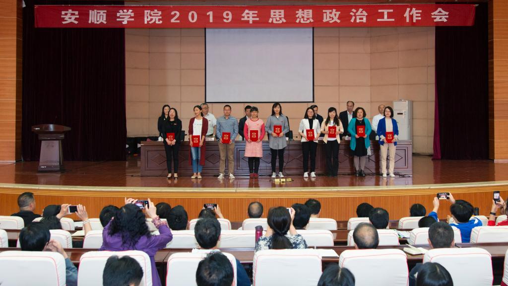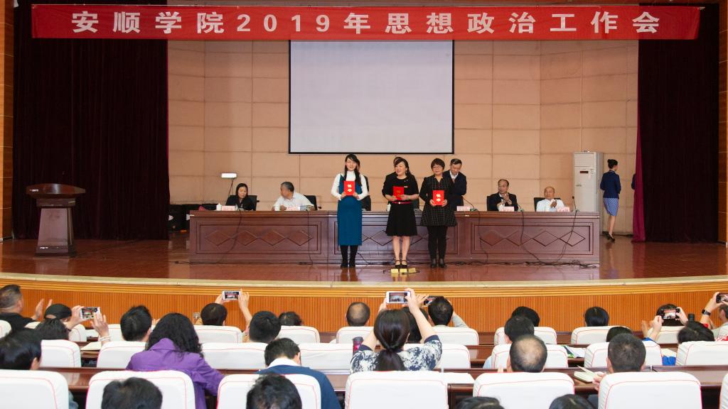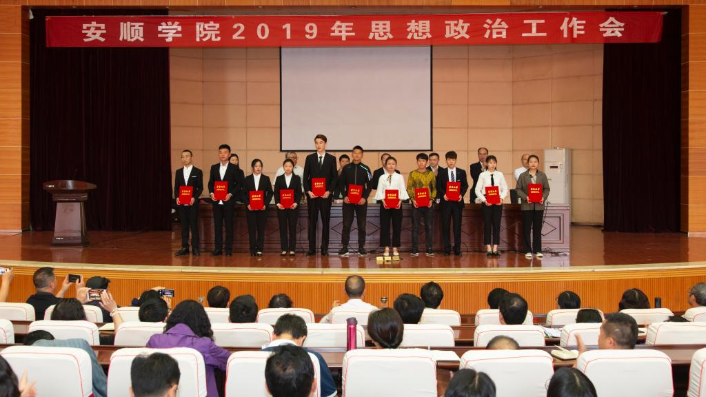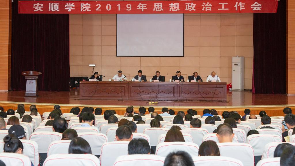 2019年4月29日下午,安顺学院2019年思想政治工作会在学术报告厅隆重召开。安顺学院党委书记罗荣彬,校长吴次南,党委副书记陶文彩,副校长顾名宇、令狐荣涛、郭本华,纪委书记蔡红英,党委各工作部门、大学生思想政治教育工作领导小组和学生工作领导小组各成员部门、各二级学院班子成员,学工部(学生处、武装部)、招就处、学生资助管理中心、团委全体人员,思想政治理论课专职教师,专职组织员,一线专职辅导员、班主任,获奖教师,先进学生集体和优秀学生个人代表,校级学生组织或团体干部代表,各学院团总支、学生会学生干部代表和其他同学代表等参加会议。会议由吴次南校长主持。