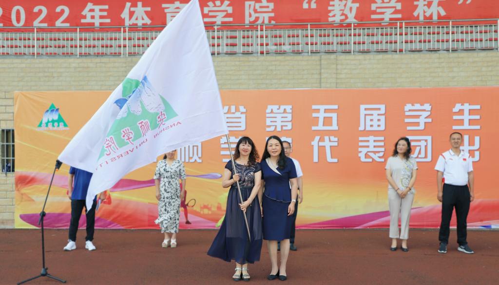 安顺学院党委委员、副校长殷红敏(右)授旗,体育学院院长邓文红(左)接旗