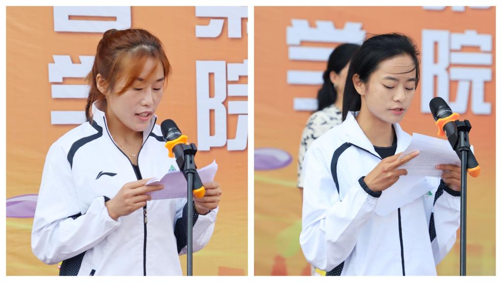 教练员代表(左)、运动员代表(右)作表态发言
