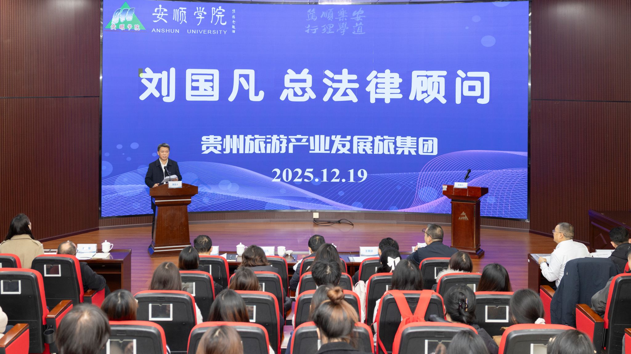 2025年12月19日下午,旅游管理学院在安道楼二楼会议室举行“文旅主理人”微专业开班仪式,标志着学校在文旅融合人才培养方面迈出实质性一步。安顺学院副校长张来、贵州旅游产业发展集团总法律顾问刘国凡出席并致辞。贵州哇噢旅游发展有限公司、贵州中壹贝山商贸有限公司、桂林三合一规划设计有限公司、贵州天悦旅游集团、贵州皓宇旅行社、安顺同袍旅游发展有限公司等企业负责人出席开班仪式,并与学院师生进行深入交流。仪式由安顺学院旅游管理学院院长赵世钊主持。