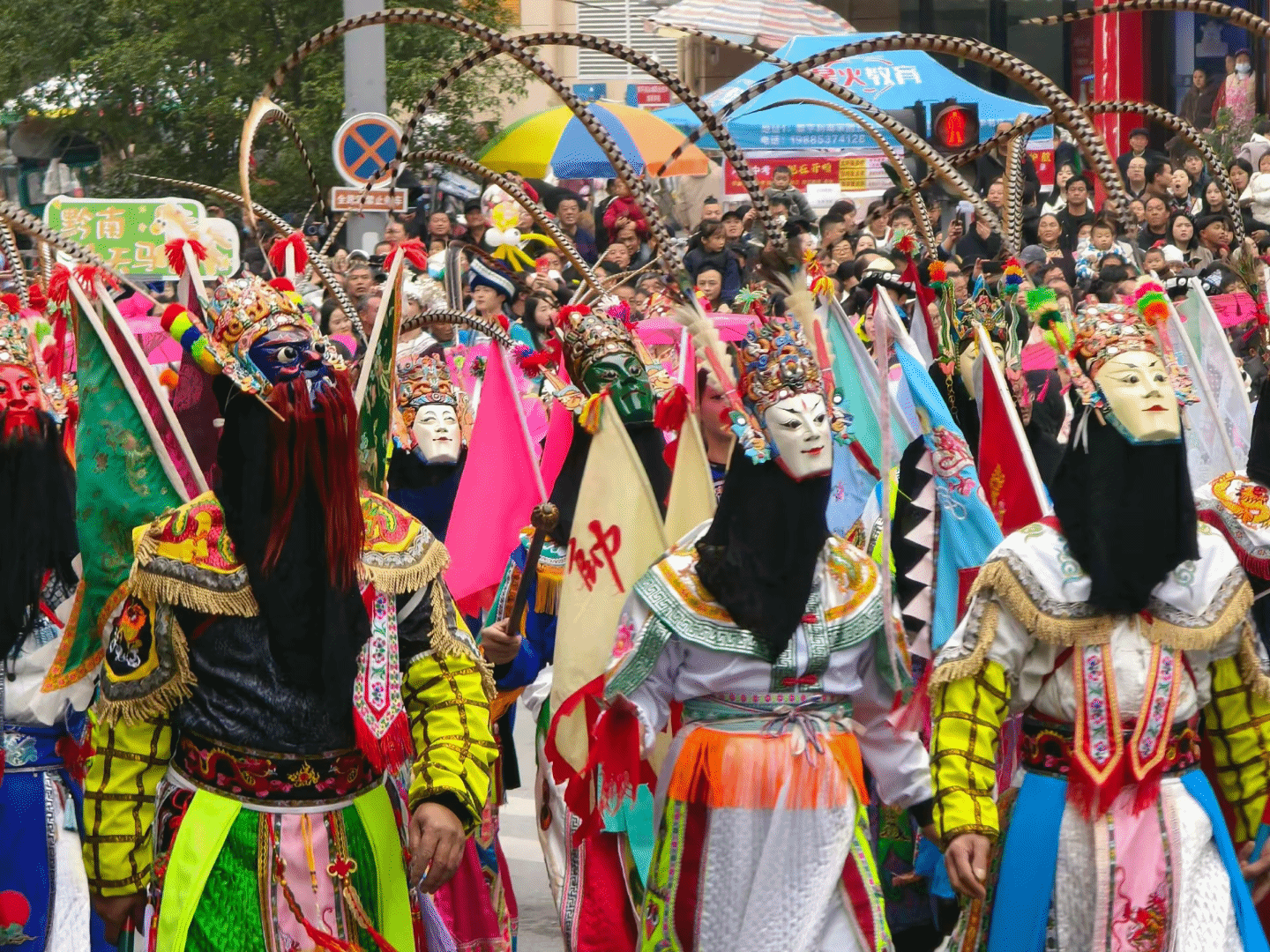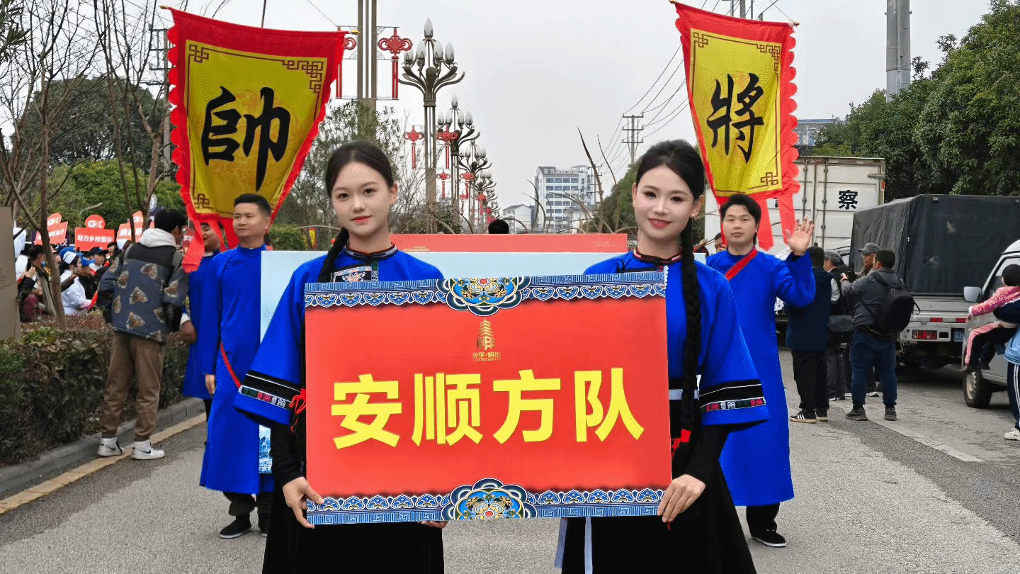 巡游中,5位学子身着色彩明丽、纹样精致的安顺屯堡服饰,头戴特色饰物,步伐整齐、仪态端庄,充分展现了航空服务艺术与管理专业学生良好的形象气质与专业素养。他们与地戏队员同台展演,屯堡服饰的庄重典雅与地戏表演的质朴豪迈相映生辉,将安顺深厚的屯堡文化与非遗魅力呈现得淋漓尽致。