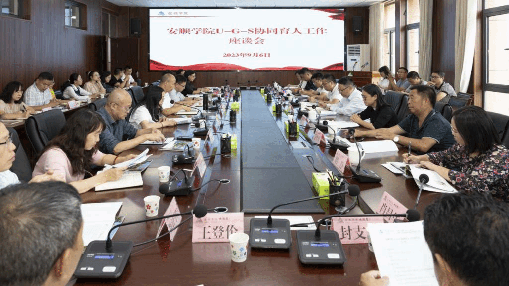 2023年9月6日下午,安顺学院U-G-S协同育人工作座谈会在安道楼第一会议室召开。中共安顺市委教育工委副书记、安顺市教育局党组成员晏雄,14个U-G-S协同育人实践基地依托的基础教育学校(含幼儿园、特殊教育学校)的党支部书记、校长、教导处等领导,安顺学院党委委员、副校长郭本华,安顺学院党委委员、统战部部长、教务处处长杜志明,安顺学院举办师范类专业的二级学院院长及负责实践教学管理的老师参加了此次会议。会议由安顺学院教务处副处长彭瑛主持。