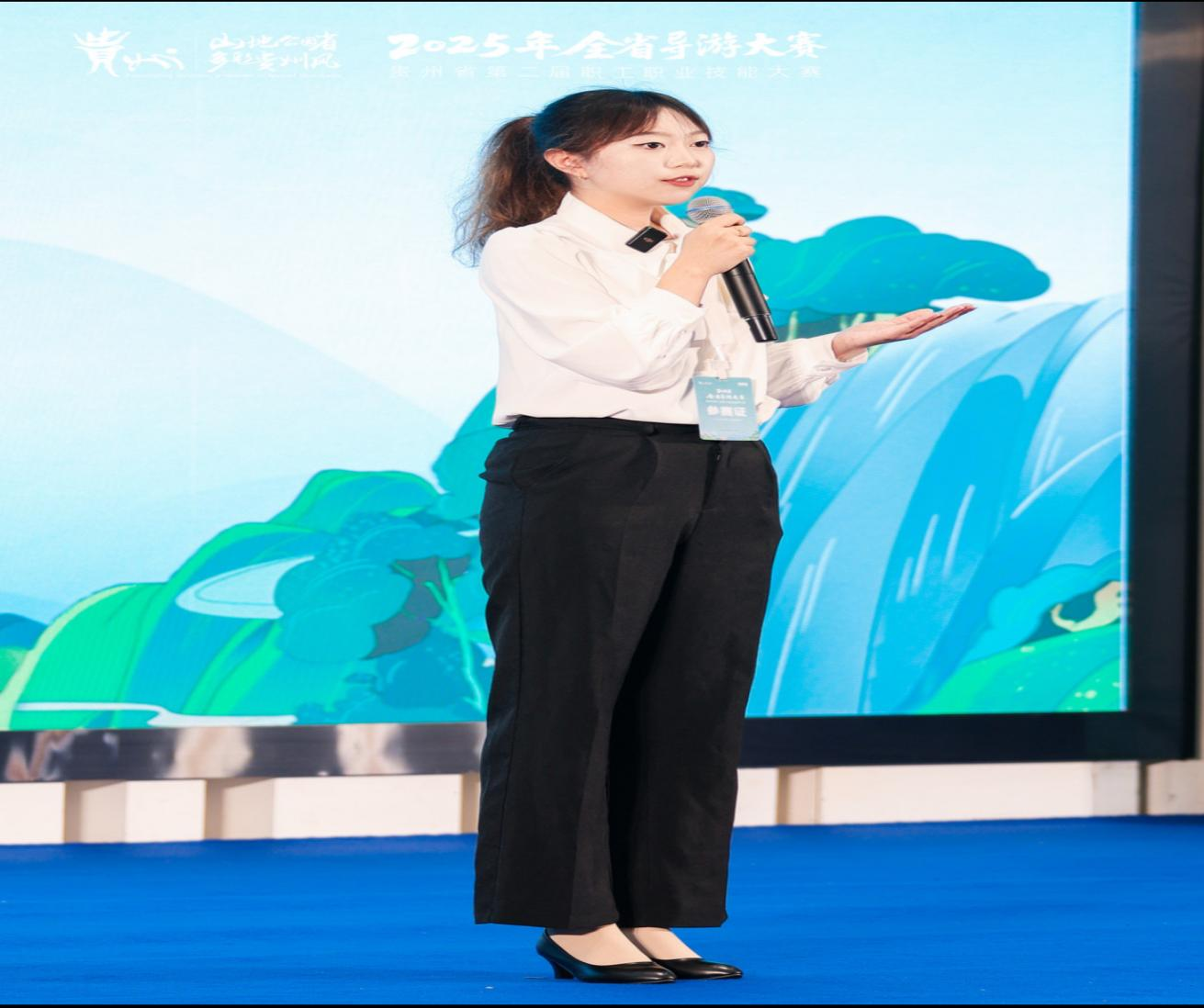 本届大赛以“赓续贵州文脉 建设旅游强省”为主题,对标国家级赛事标准,设置了主题讲解推介、综合知识问答、导游词创作、实地模拟带团、1v1 对抗及主题演讲六大环节。赛事全程贯穿文化传承理念,不仅考察选手的语言表达和知识储备,更注重检验其实际带团能力与文化传播使命。大赛首次增设英语语种赛项,要求选手以国际化视角阐释贵州文旅魅力,为国际导游班学生提供了展示外语专长的舞台。