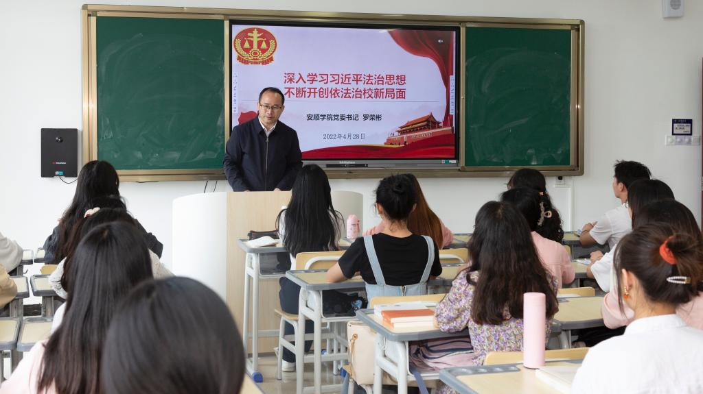 为深入学习贯彻习近平法治思想,提升依法办学和依法治校水平,2022年4月28日,安顺学院党委书记罗荣彬到政法学院开展法治教育专题课,政法学院师生代表、宣传部部分教师到场聆听。