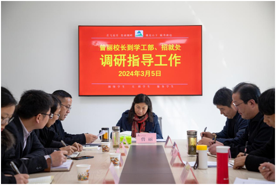 3月5日,安顺学院校长曾丽到学生工作部(学生工作处、武装部)、招生与就业指导处调研指导工作。党政办公室相关人员参加调研,学生工作部(学生工作处、武装部)、招生与就业指导处全体人员参加调研座谈会议。