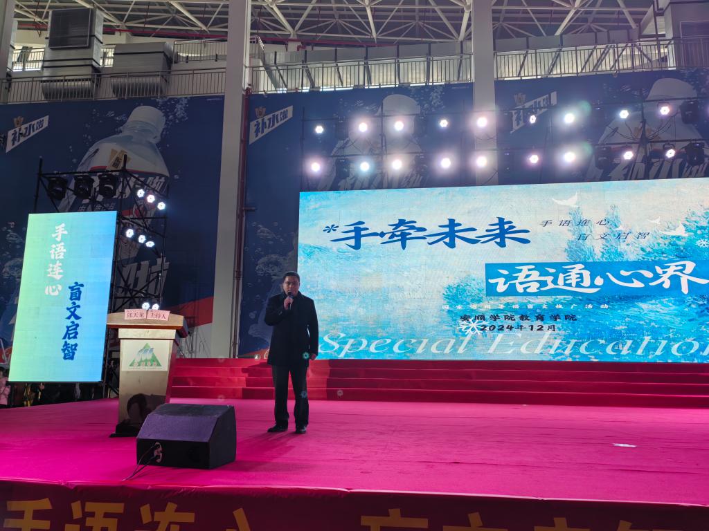 安顺学院特殊教育学院院长邱天龙宣布“手牵未来·语通心界”国家通用手语盲文推广活动开幕