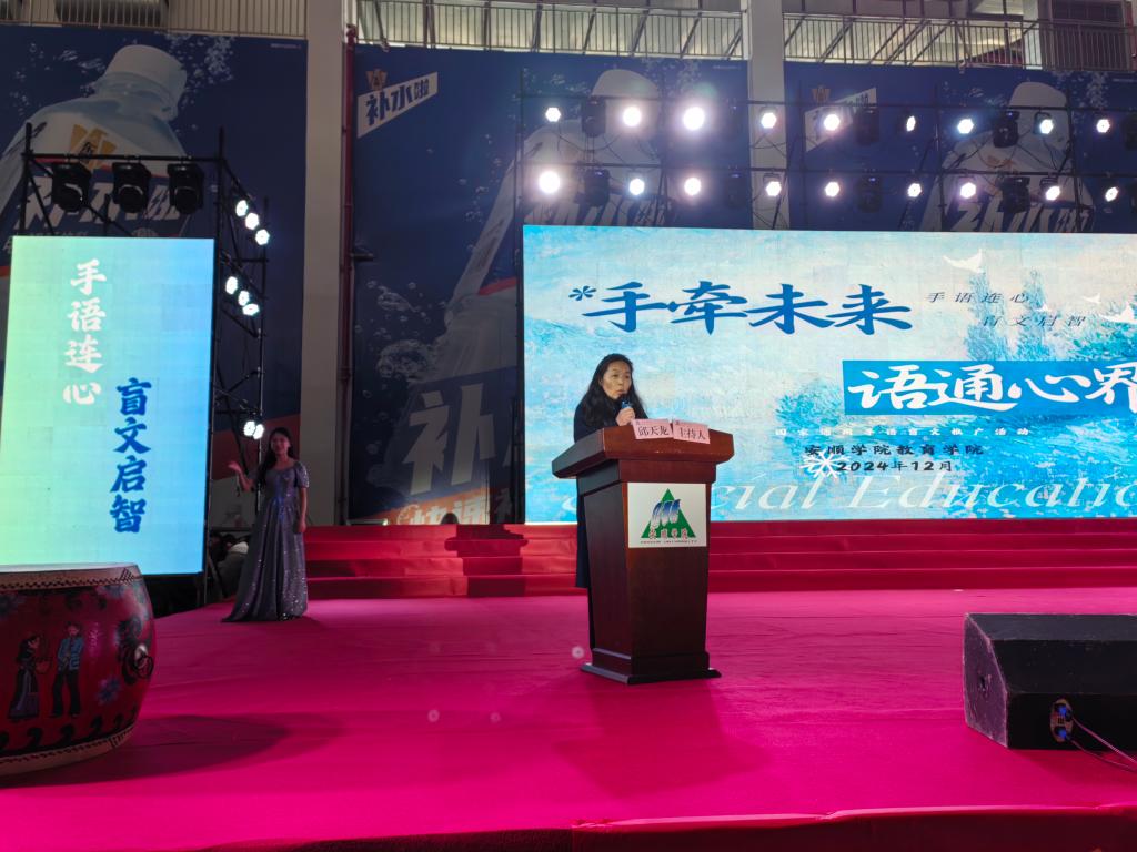 殷红敏致辞。她强调,语言文字关系到国家的统一、民族的团结、经济的发展、社会的进步、历史的传承、文化的认同。手语、盲文是听障、视障人士交流沟通的语言文字,国家通用手语和国家通用盲文则是手语、盲文的“普通话”,党的二十大报告对发展残疾人事业提出明确要求。为进一步落实贵州省语言文字工作委员会的要求,促进国家通用手语和国家通用盲文的普及推广,基于全国第二十七届推广普通话宣传周“加大推普力度,筑牢强国语言基石”的主题,安顺学院以国家通用手语、国家通用盲文为载体,以“手牵未来,语通心界”为主线,开展系列推广活动,主要展示贵州省语言文字推广基地的建设成果,引导群众参与并感受国家通用手语和国家通用盲文的魅力,大力提升宣传效应,推进信息无障碍环境建设、促进残健融合,促进手语、盲文应用规范化,通过推广国家通用手语和国家通用盲文,消除听障、视障人士与健全人之间的隔阂,增进听障、视障人士和健全人的无障碍沟通氛围,提高助残的服务质量。