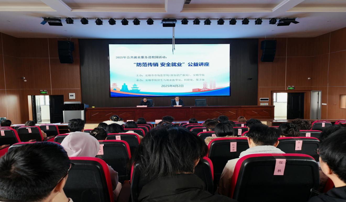 为切实维护毕业生就业合法权益,增强风险防范意识,护航学子平安步入职场,4月2日,安顺学院在博学楼举办“防范传销安全就业”专题公益讲座。活动特邀请安顺市市场监督管理局反不正当竞争与直销监管科科长娄鹏飞担任主讲,安顺学院150余名学生代表参加活动。