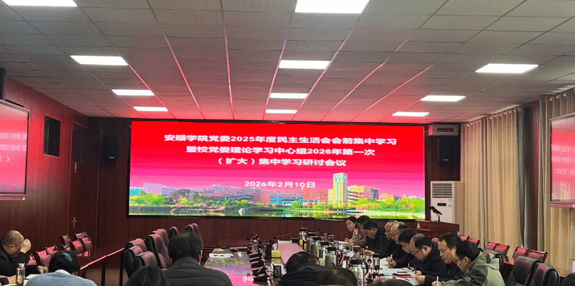 2026年2月10日,安顺学院召开党委2025年度民主生活会会前集中学习暨校党委理论学习中心组2026年第一次(扩大)集中学习研讨会议,深入学习领会习近平总书记关于党的建设的重要思想、关于党的自我革命的重要思想以及关于加强党的纪律建设、作风建设的重要论述以及习近平总书记有关重要讲话、重要指示批示精神等内容。