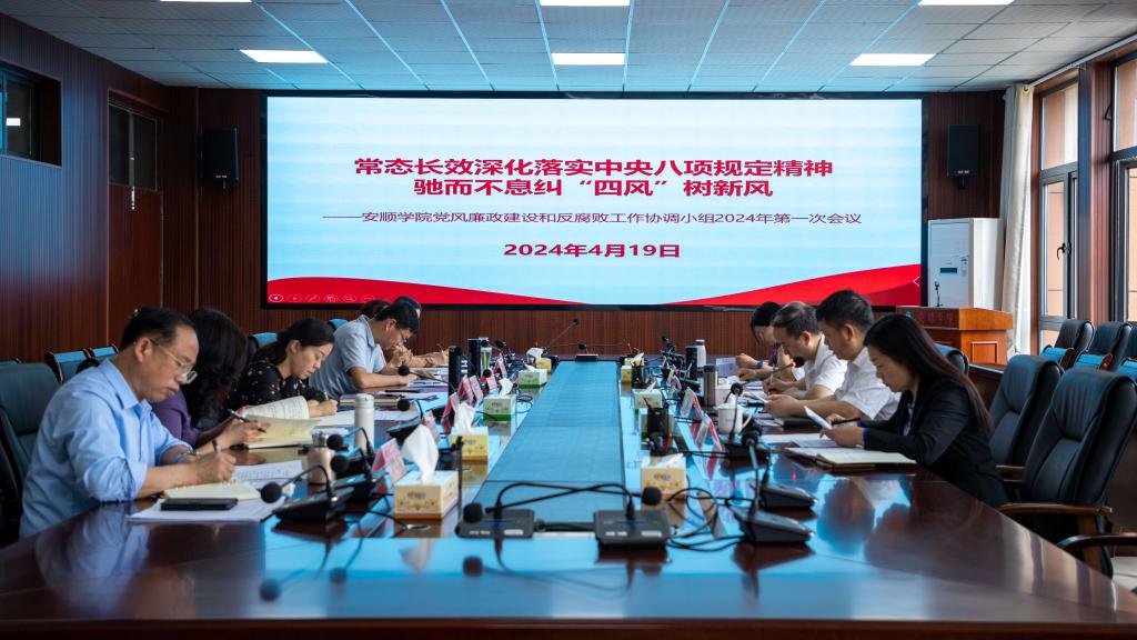 2024年4月19日下午,安顺学院党风廉政建设和反腐败工作协调小组2024年第一次会议在安道楼五楼第一会议室召开,会议主题为“常态长效深化落实中央八项规定精神,驰而不息纠‘四风’树新风”。安顺学院党委书记罗荣彬和有关校领导出席会议,学校党风廉政建设和反腐败工作协调小组成员单位参会,学校巡察办、巡视整改办主要负责人列席。会议由安顺学院党委副书记陶文彩主持。
