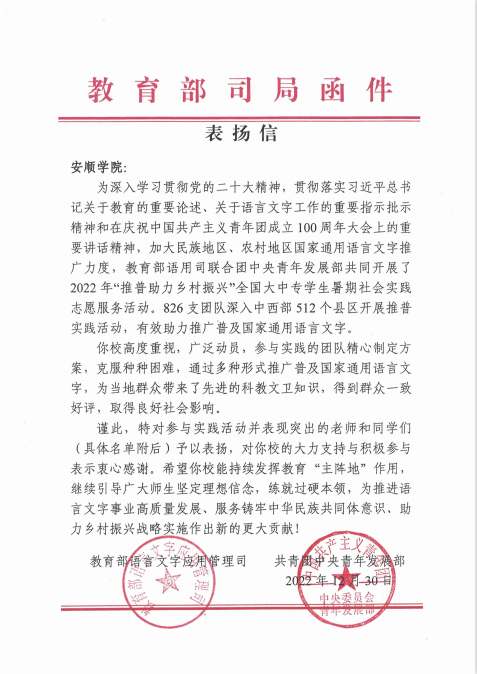 近日,教育部语言文字应用管理司、共青团中央青年发展部致函安顺学院荣获2022年“推普助力乡村振兴”全国大中专学生暑期社会实践志愿服务优秀团队。