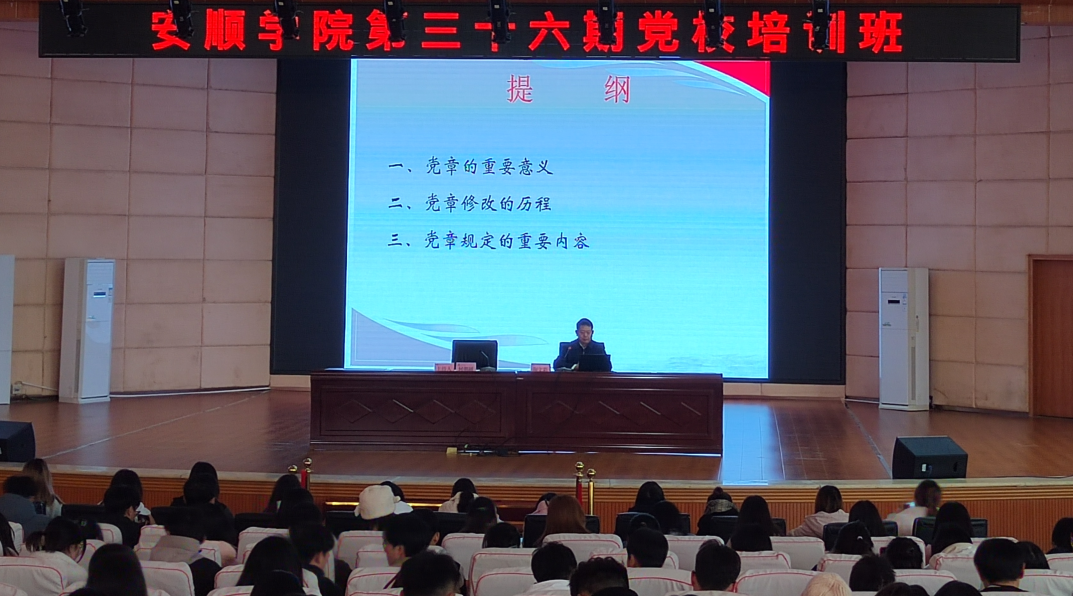 2023年11月13日,安顺学院第36期党校培训班在学术报告厅开班,安顺学院党委副书记陶文彩出席开班仪式并授课,485名入党积极分子和发展对象参加学习培训。安顺学院党委委员、党委组织部部长何朝越主持开班仪式。