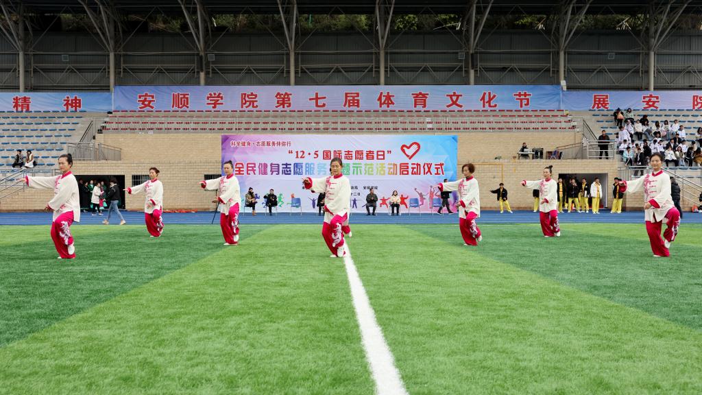 12月12日下午,“科学健身·志愿服务伴你行”2022年安顺市全民健身志愿服务主题示范活动启动仪式在安顺学院运动场开幕。安顺市文体广电旅游局、安顺市太极拳协会、西秀区体育舞蹈协会、紫云文艺学校、安顺学院体育学院相关负责人参加启动仪式。