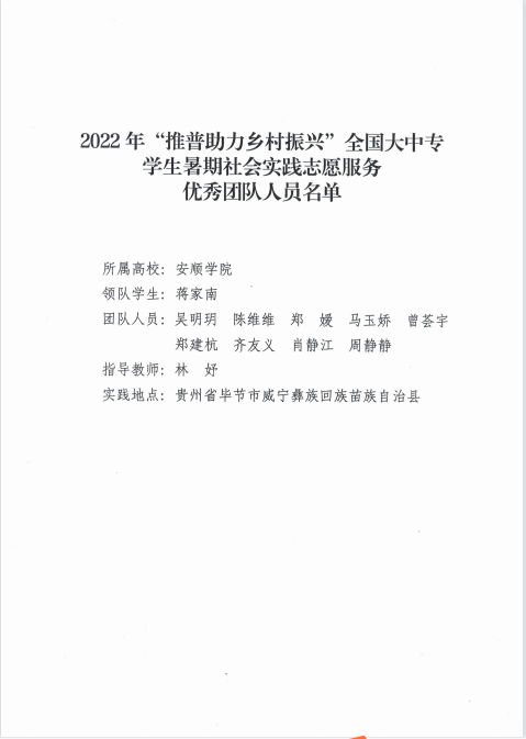 近日,教育部语言文字应用管理司、共青团中央青年发展部致函安顺学院荣获2022年“推普助力乡村振兴”全国大中专学生暑期社会实践志愿服务优秀团队。